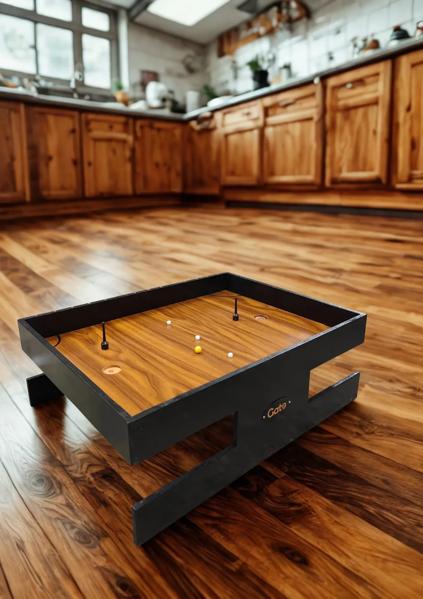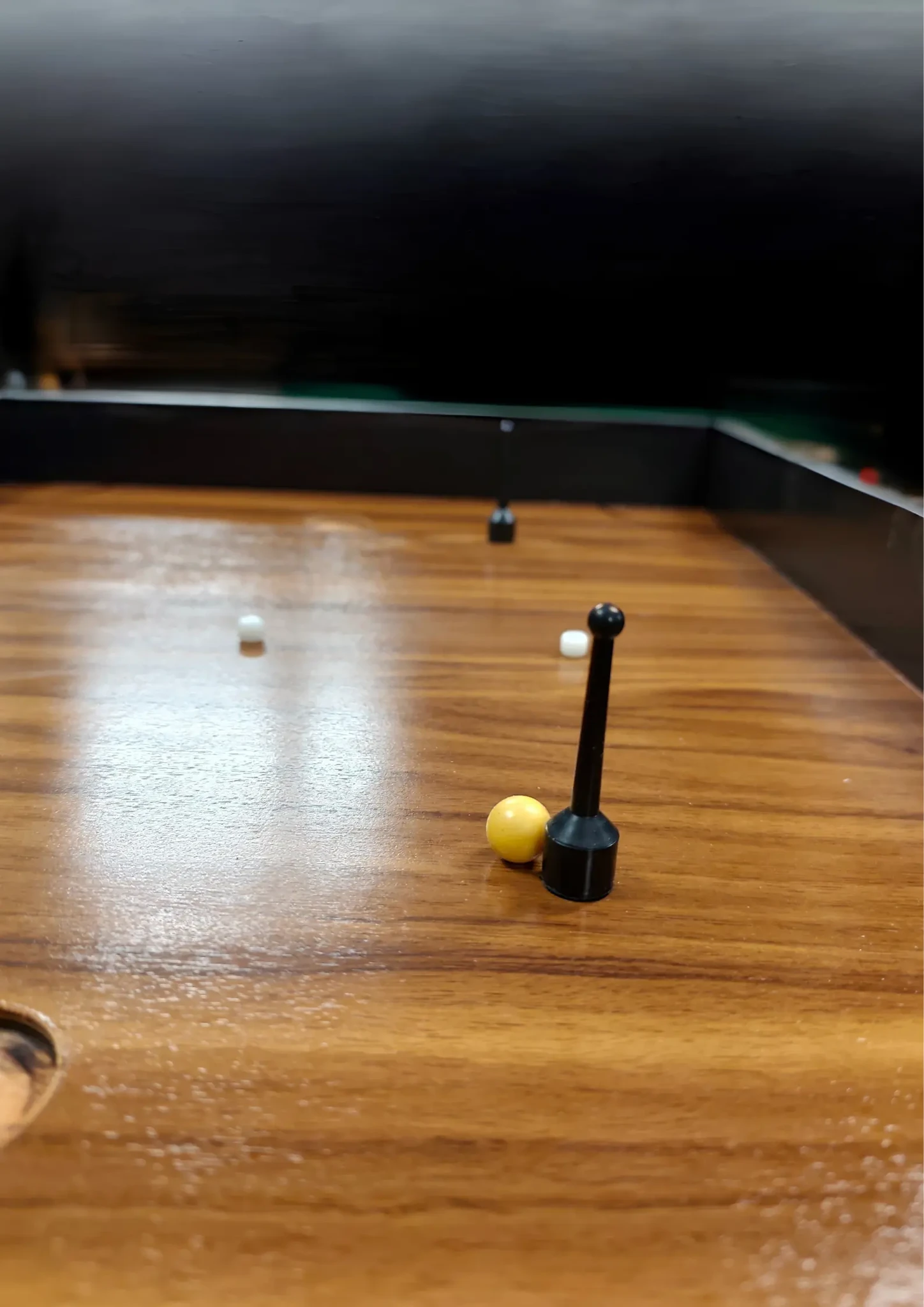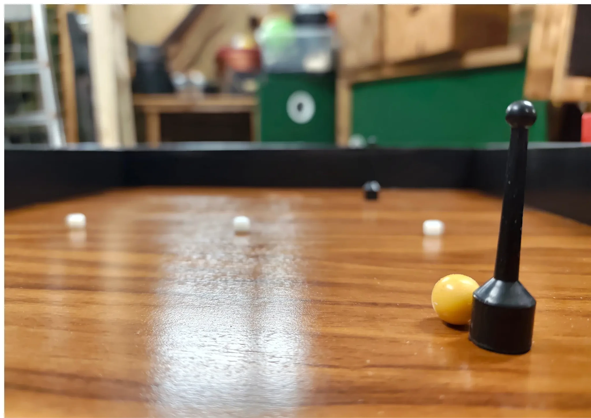 Klask is a game from Denmark that is a mixture of table football and table hockey. It is played 1vs1. The goal is to get the ball into the hole on the opponent's side, it gives 1 point. The ball is hit with magnets, meaning that one side of the magnet is on the table and the other (which the player holds) is under the table. There are three more white magnets on the table that should be kept away from, because if two white ones stick to your button, it means 1 extra point for the opponent. In addition, you must keep away from the hole in your half of the game board, if you get stuck there it will give 1 point to your opponent again. The game goes up to 7 points (you already start on 1). The younger player can start the game and he has to do it from one of his own corners. The same goes for every point you score. In addition, white magnets must be placed back before the start of each round. The set includes 1 Klask table, 1 ball, 4 large magnets, 3 small magnets, 2 wooden pegs for keeping score.