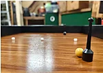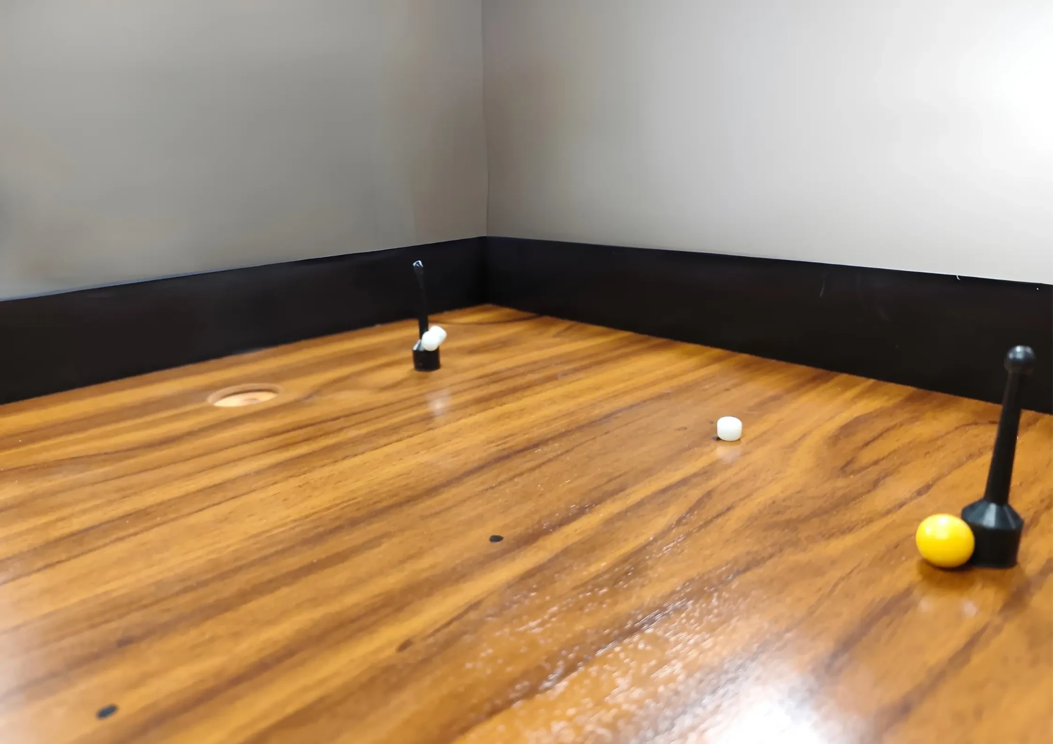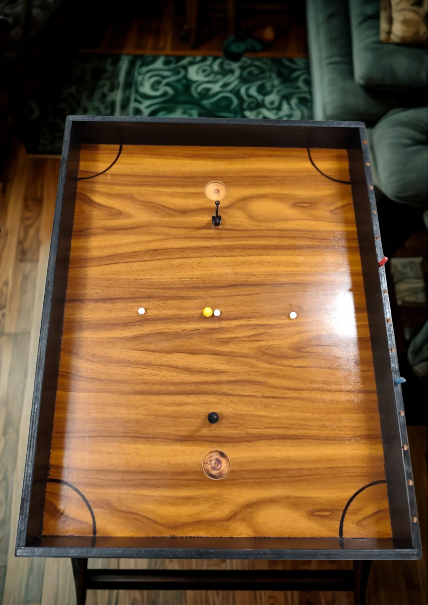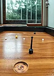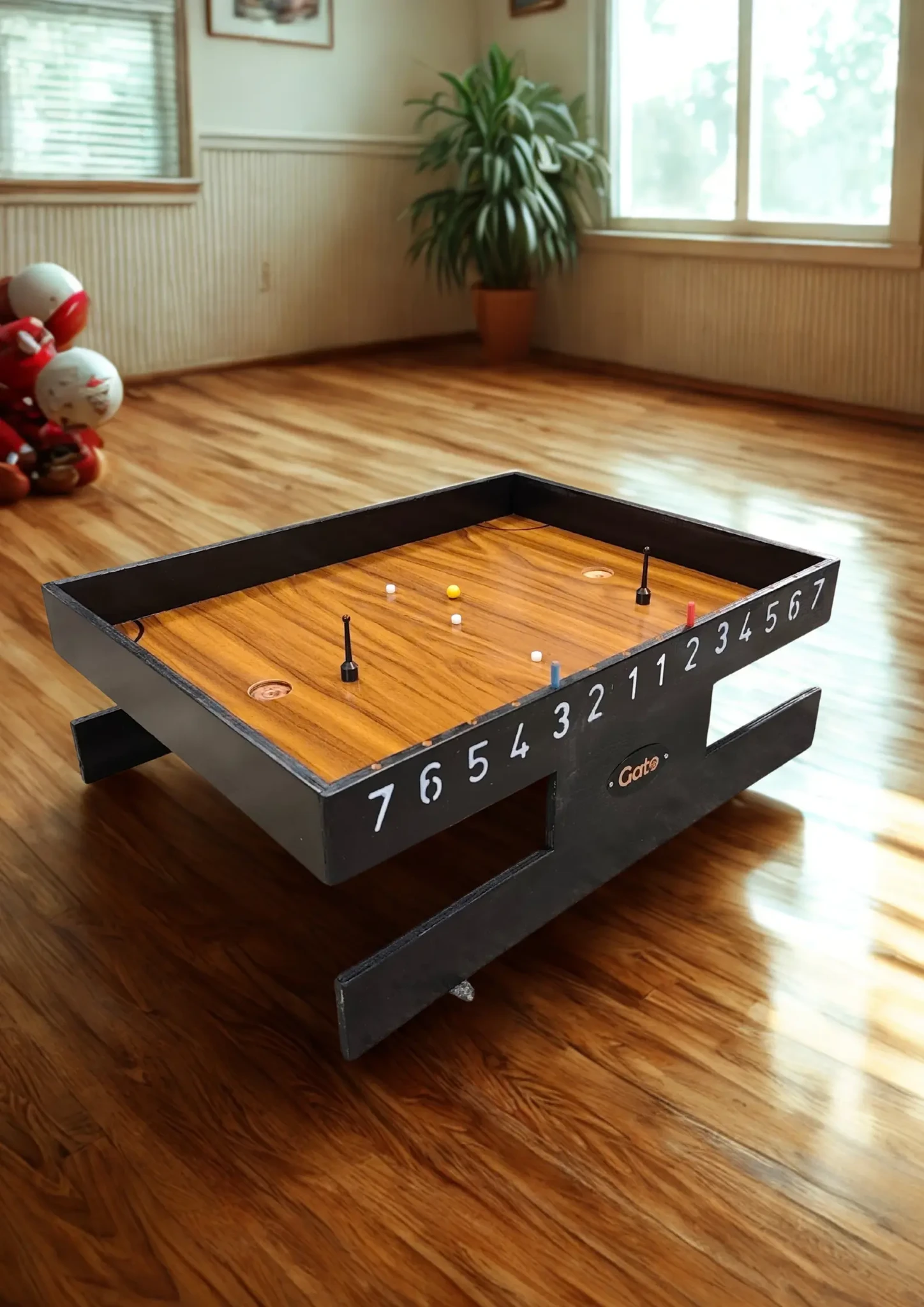 Klask is a game from Denmark that is a mixture of table football and table hockey. It is played 1vs1. The goal is to get the ball into the hole on the opponent's side, it gives 1 point. The ball is hit with magnets, meaning that one side of the magnet is on the table and the other (which the player holds) is under the table. There are three more white magnets on the table that should be kept away from, because if two white ones stick to your button, it means 1 extra point for the opponent. In addition, you must keep away from the hole in your half of the game board, if you get stuck there it will give 1 point to your opponent again. The game goes up to 7 points (you already start on 1). The younger player can start the game and he has to do it from one of his own corners. The same goes for every point you score. In addition, white magnets must be placed back before the start of each round. The set includes 1 Klask table, 1 ball, 4 large magnets, 3 small magnets, 2 wooden pegs for keeping score.